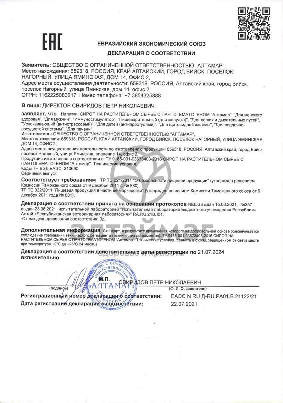 Есть вопросы по товару "Сироп с пантогематогеном Алтамар для печени 250мл"?