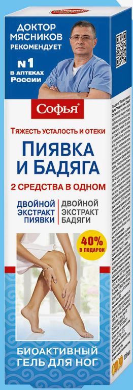 Софья экстракт пиявки с бадягой – натуральное эффективное средство, которому доверяют миллионы женщин во всем мире. Гель Софья обеспечивает комплексное воздействие и оказывает действенную помощь в поддержании красоты и здоровья ног, нормализует микроциркуляцию и лимфоотток, снижает ломкость капилляров, улучшает эстетический вид ног. Благодаря выраженному охлаждающему эффекту, возвращает ногам комфортное чувство легкости и прохлады, снимает усталость и тяжесть в ногах, способствует расслаблению мышц.